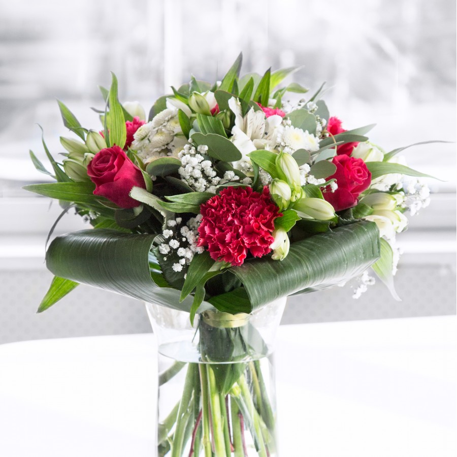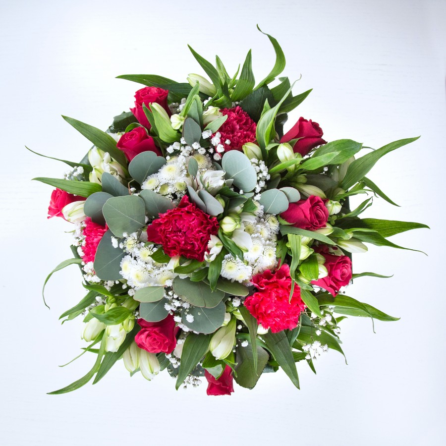 Experience the unique charm of our meticulously crafted bouquet. This stunning collection features white chrysanthemums, delicate gypsophila, rich red roses, and elegant carnations, beautifully complemented by white alstroemeria and vibrant aspidistra leaves.