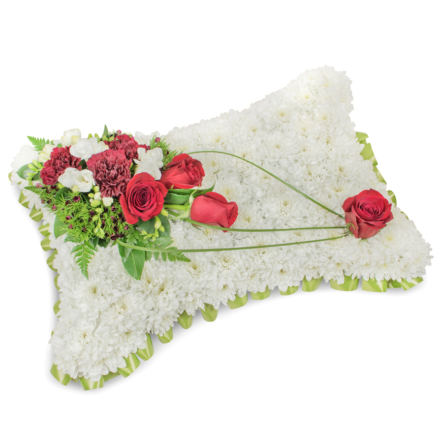 Offer your sincere sympathy with this beautiful arrangement composed of white chrysanthemums, crimson roses, ivory freesias, dark red carnations, complemented by graceful dianthus and soothing bear grass.